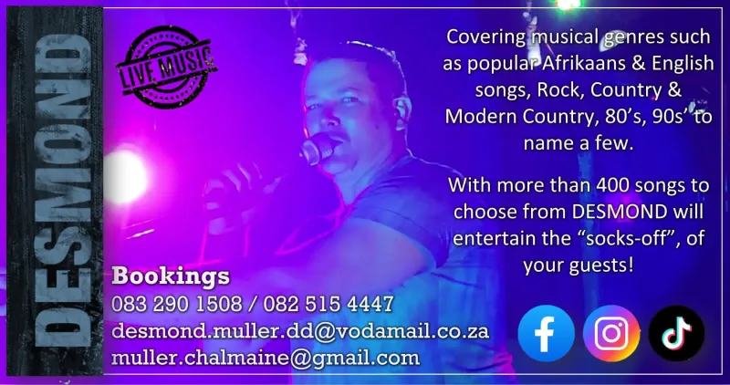 Covering musical genres such as old time rock, modern country, rock, current Afrikaans & English, 80’s, 90s’ but to name a few. With more than 400 songs to choose from DESMOND will be able to entertain the socks off of your guests! He ‘reads’ his crowd perfectly …be it music to listen to and or to dance to.